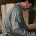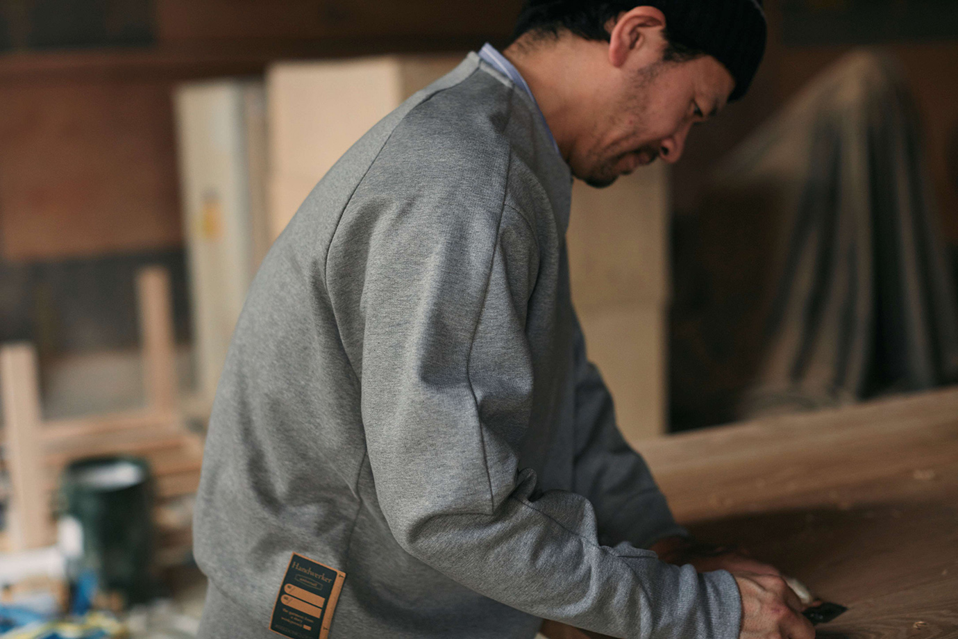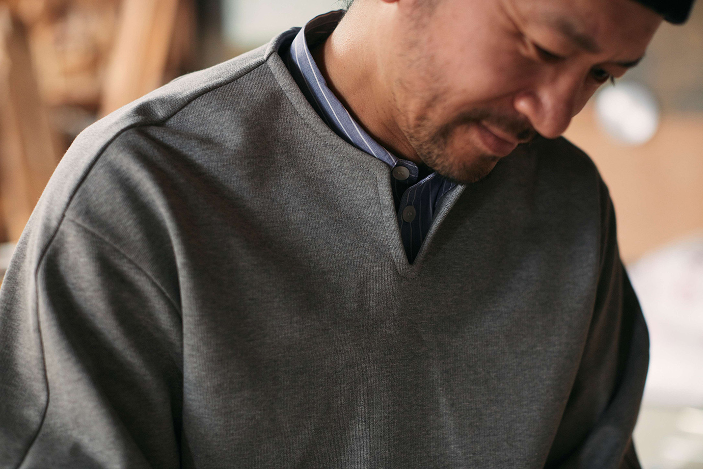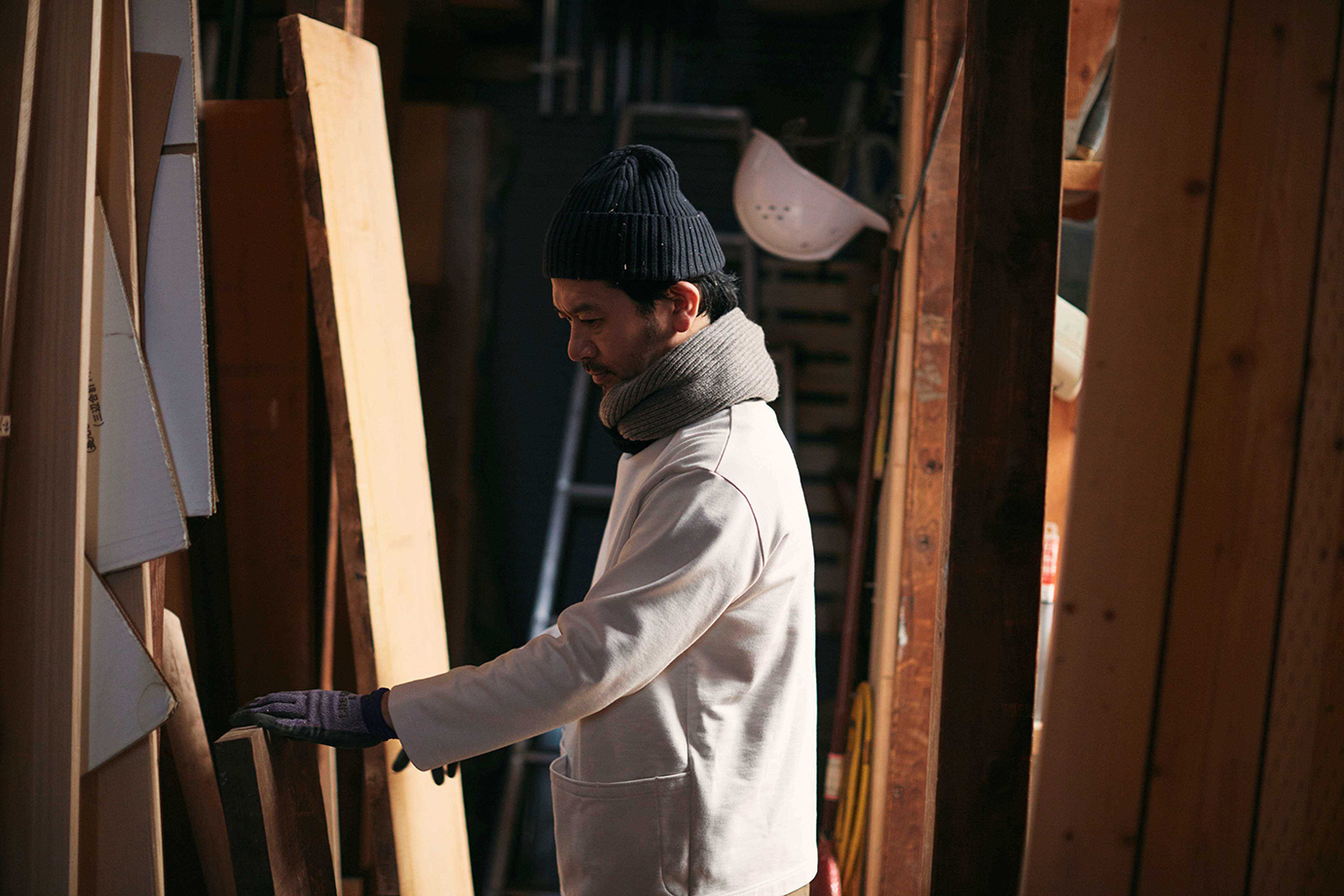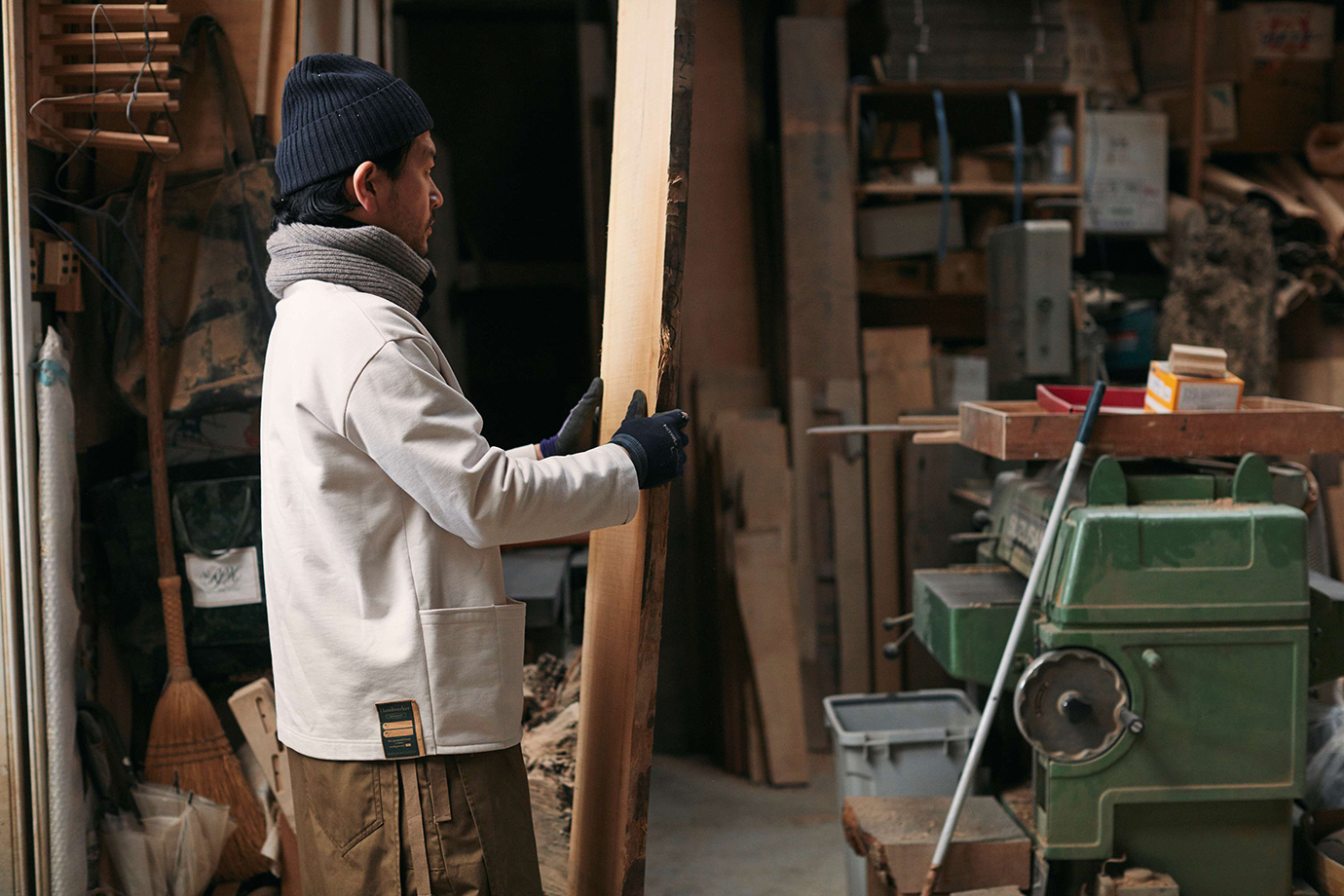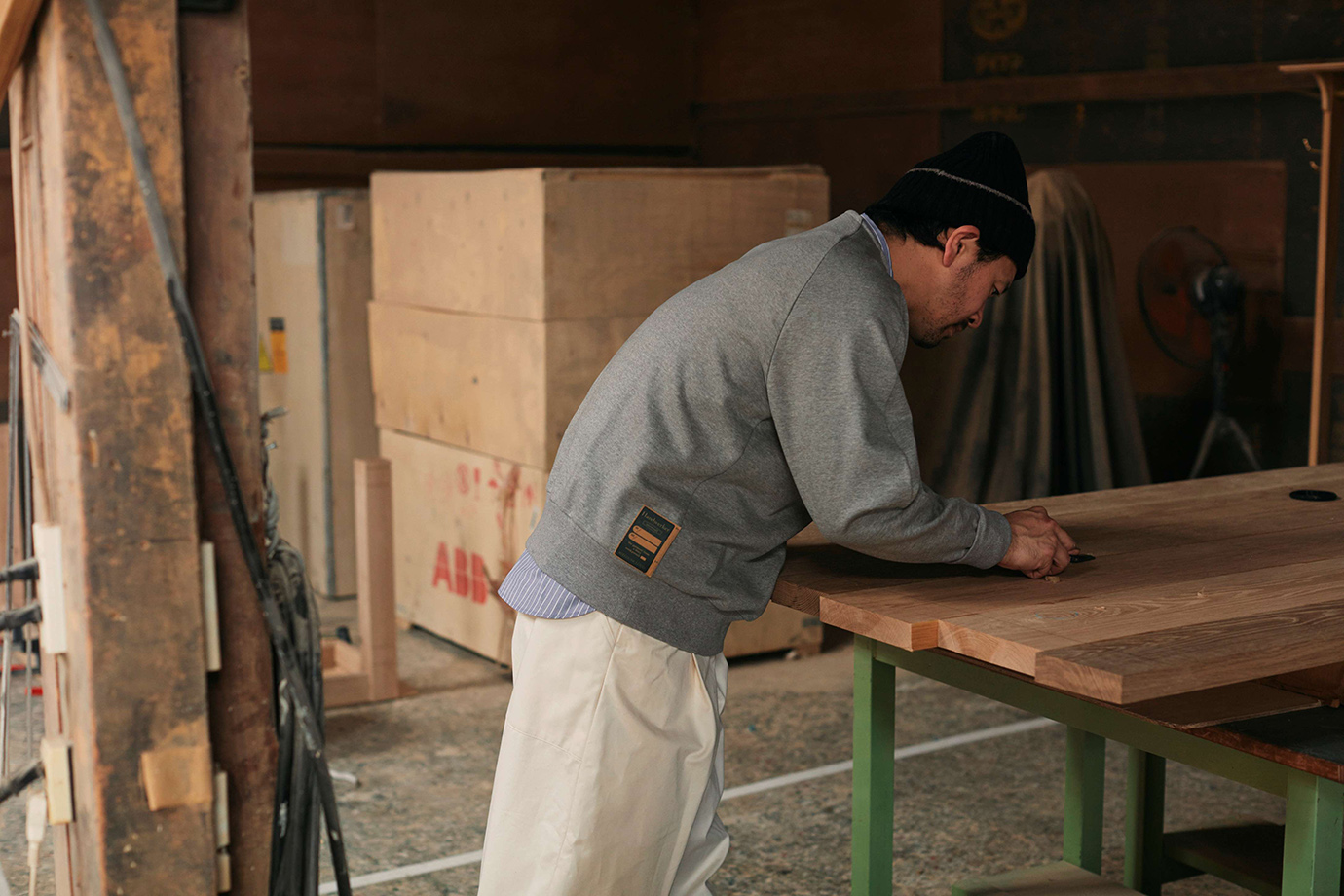 服にはあまり興味がなくて、ふだんからいつもあり合わせのものを着ているし、破れてもあまり気にしません(笑)。若いときは見た目を気にして服を買ったこともあったし、会社勤めのときはスーツを着ていましたが、いまはほぼ毎日、朝から夜遅くまで工房で作業をしているので、こだわりもまったくなくて。靴だけは、5〜6種類を試した結果、丈夫で足がつかれにくいメレルというアウトドアメーカーのシューズに決めていますが、服は着古した普段着です。ワークショップなどで人前に出るときは襟つきのシャツを着ますが、作業中は軽く、動きやすくて、汚れても気にならないものがよくて、夏はTシャツ、冬はスウェットや薄手のダウン。作業をしていると木くずがたくさんつくし、ズボラなので手についた油を服でふくこともあって、洗ってもとれない。機械に引っかけたり、表面がガサガサした木材を抱えたりして、破れることもあるので、作業中に着る服は消耗品になってしまって。それなら丈夫なものがいいかと思うと、丈夫すぎるとかえって動きづらいんですよね。ずっと「作業に向いている服がほしい」と思っていたので、今回はうれしかったです。