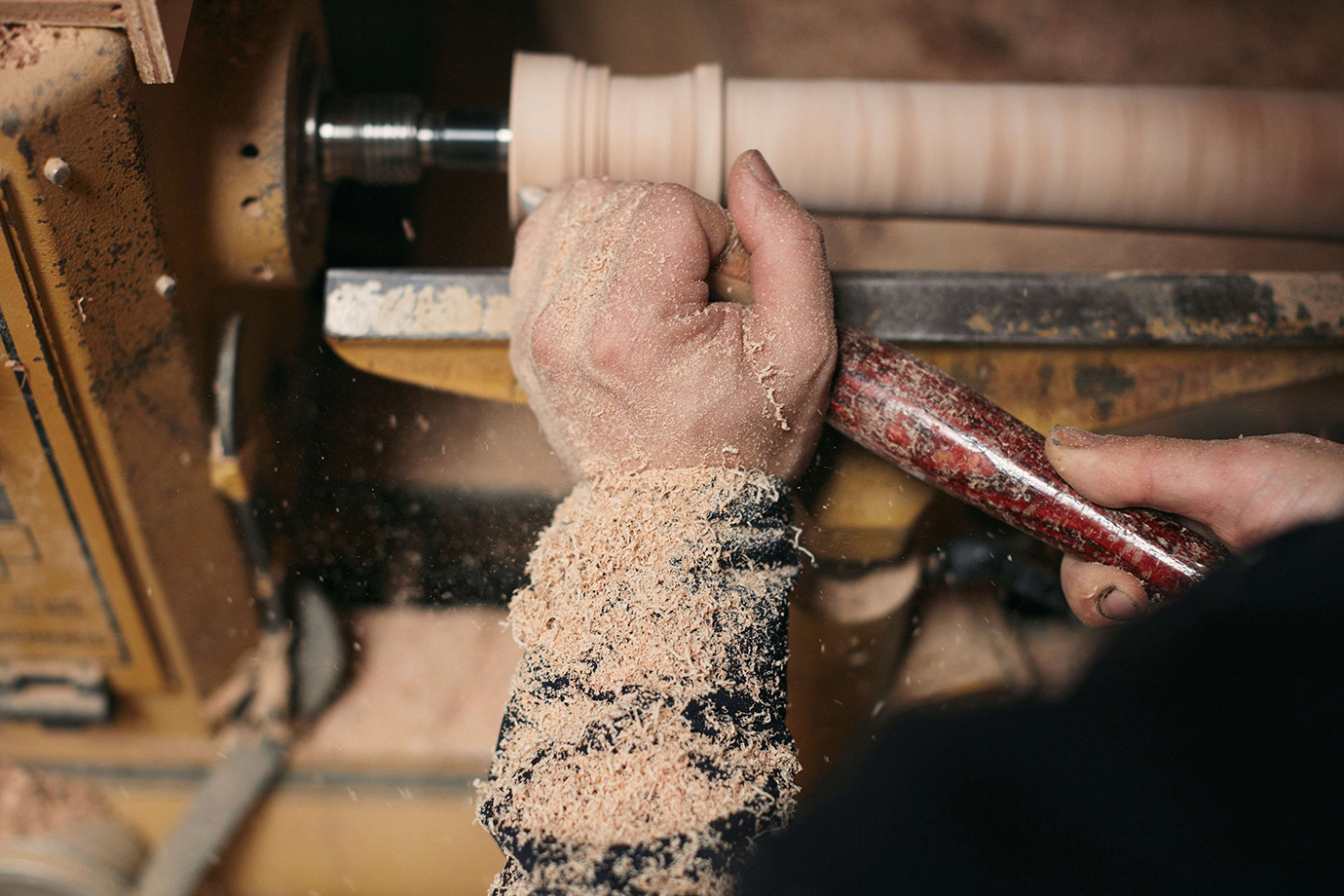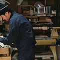 木が本来持つ、模様や割れやふし、ゆがみなどをいかした家具や小物が人気を集める吉川和人さんは、木工作家として活動し始めて6年。自宅からほど近い、老舗材木店の一角にある工房で、朝から晩まで作業をしています。自然にあふれた土地で育ち、子どものころからものづくりが好きでしたが、大学卒業後は外資系の家具メーカーに就職し、営業職や企画職を担当。職人と接するうちに、次第に自分でも作りたいという思いが強くなっていったといいます。