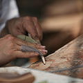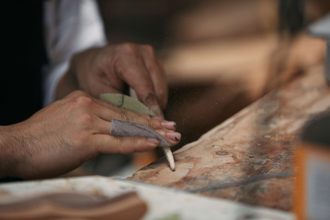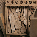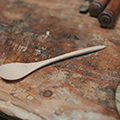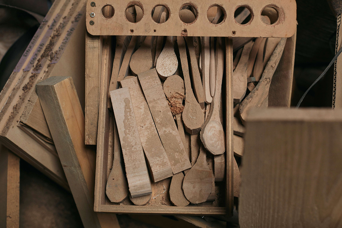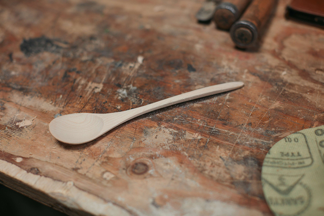 生木は、丸太から木地(荒挽き・荒削りした材料)にして、器に仕上げるまでに、数回の乾燥を含めると1年ほどかかります。あらゆる木地からイメージに合うものを選んで型取りを行い、切り出したら、ナイフやカンナ、紙ヤスリで削りながら形を整えていきます。仕上げは必ず手で行うことで、使う人の手にもなじむものになると思っています。