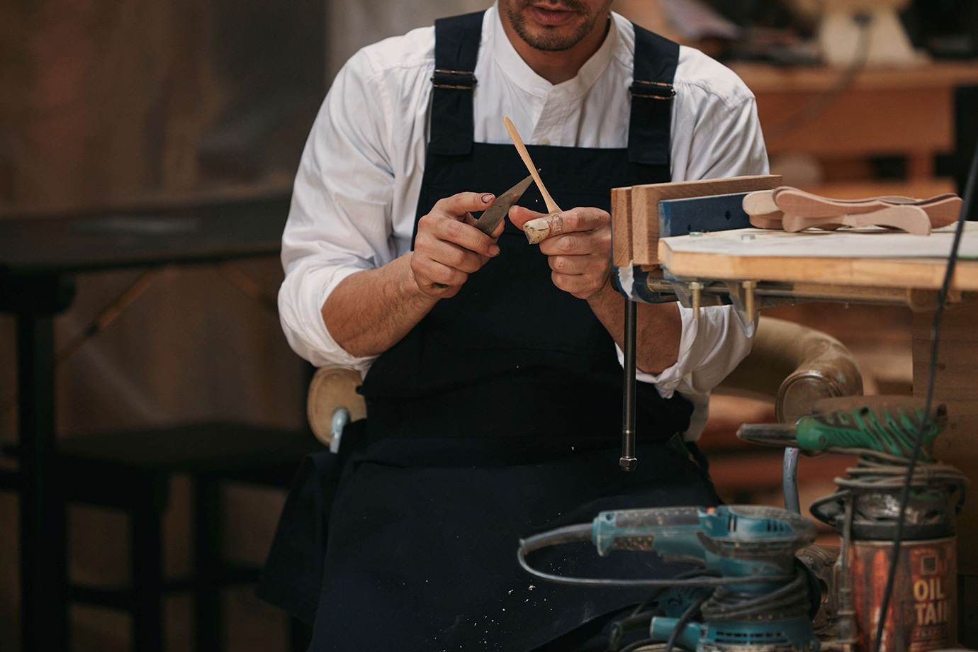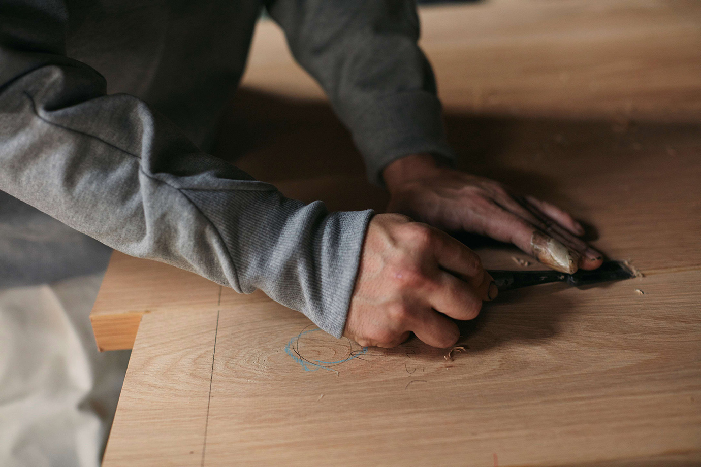福島県の田舎で生まれ育ったのですが、家のすぐ裏が森で、毎日のように木登りをしたり、拾った枝で工作したりして過ごしていました。2階にあった自分の部屋の窓際まで伸びたクルミの木の枝を削って、母の日にさじを作ってプレゼントしたこともありましたね。そのころの経験が私の原点だと思います。ものを作ることにずっと憧れはありましたが、専門的な技術もないので、大学卒業後はデザインやものづくりの周辺で生きていこうと、カッシーナ・イクスシーというイタリア系の家具メーカーに入りました。営業職や企画職を担当していたのですが、デザイナーが手がける家具や現場の職人たちと接するうちに、思いがどんどん募っていって。そんなとき東日本大地震が起こって、人生について改めて考えて「やりたいことをやろう」と、12年勤めた会社を辞めました。