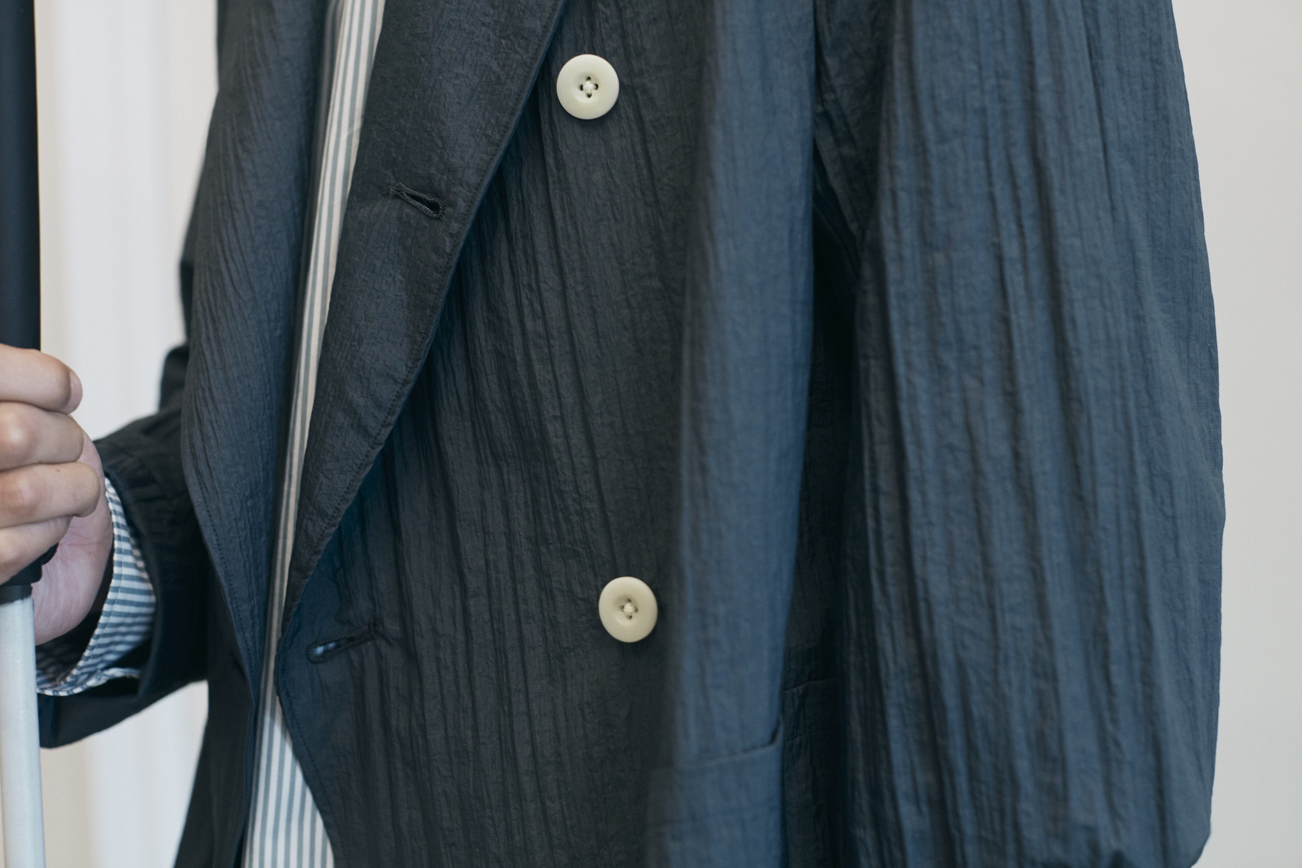 好きですが、バリエーションはそんなに持っていないです。Tシャツとシャツとニットぐらい。 買うときは、目が見える人に「青いシャツ」など、その服の色や特徴を教えてもらって、手ざわりとひもづけて記憶していきます。質感やポケットの場所、刺しゅうがあるかないか、シャツなら襟にボタンがついているかついていないか、などですね。そうはいっても、だんだん忘れてしまうのですが。 ボタンがつまみづらかったり、羽織るときに袖を探すのが大変だったり、脱ぎ着に時間がかかる服は 敬遠しがちかもしれないですね。