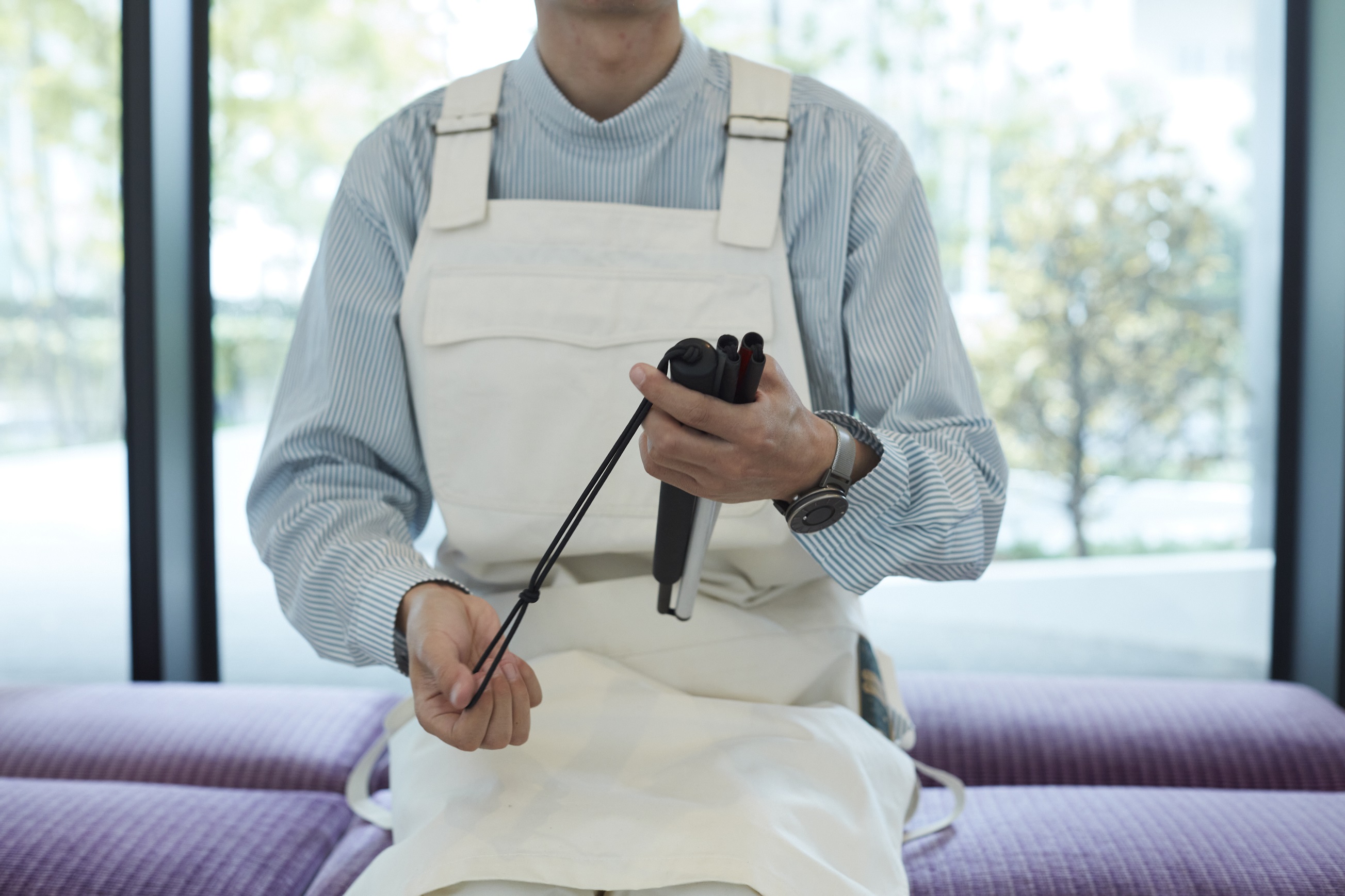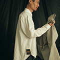 あとポケットってだいたいは縦型で、上からものを入れますよね。このシャツのポケットは斜めだから、使いやすさもあるけれど、ちゃんとものがおさまるかなという不安が少しだけありました。ふだんシャツを着るときより集中力が必要だし、いつもは着る、羽織る、脱ぐというのは意識しなくても体が勝手にできてしまいますが、「シャツを着ている」というのをすごく意識させられます。そこがおもしろいところですね。見た人は「あれ」って思うかもしれないけれど、体はすごく自然でいられます。まわりからどう思われようが、服の中の人、つまり体が正解を知っているから。